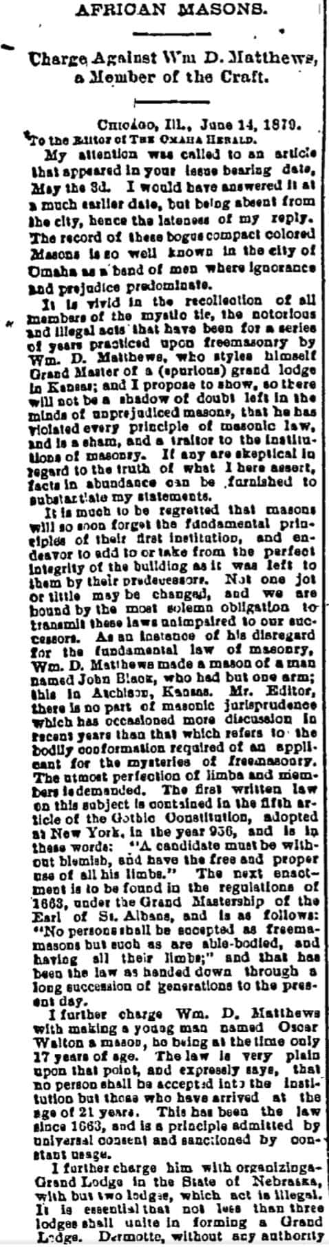 Notably, Jones openly attacked William D. Matthews, declaring in his 1903 circular letter, “I denounce Matthews and his bogus compact brethren as pretended Masons unworthy of our ancient Craft,” a prominent leader associated with the National Grand Lodge, labeling him a "sham" and "traitor," and publicly condemning the National Grand Lodge itself as composed of "bogus compact-colored Masons." Jones also made serious allegations against Matthews, accusing him of violating fundamental Masonic principles by initiating underage and physically impaired candidates. These accusations were documented in widely circulated publications of the time and contributed significantly to the public discourse around Masonry among African American communities.